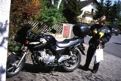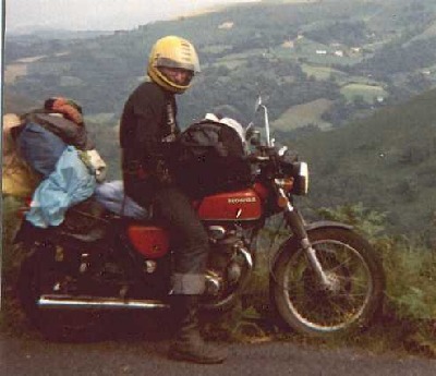 Tour mit der Honda CB250 über Südfrankreich an die spanische Atlantikküste mit 2 Personen und Campingausrüstung. Das Bild wurde in den Pyrenäen aufgenommen.